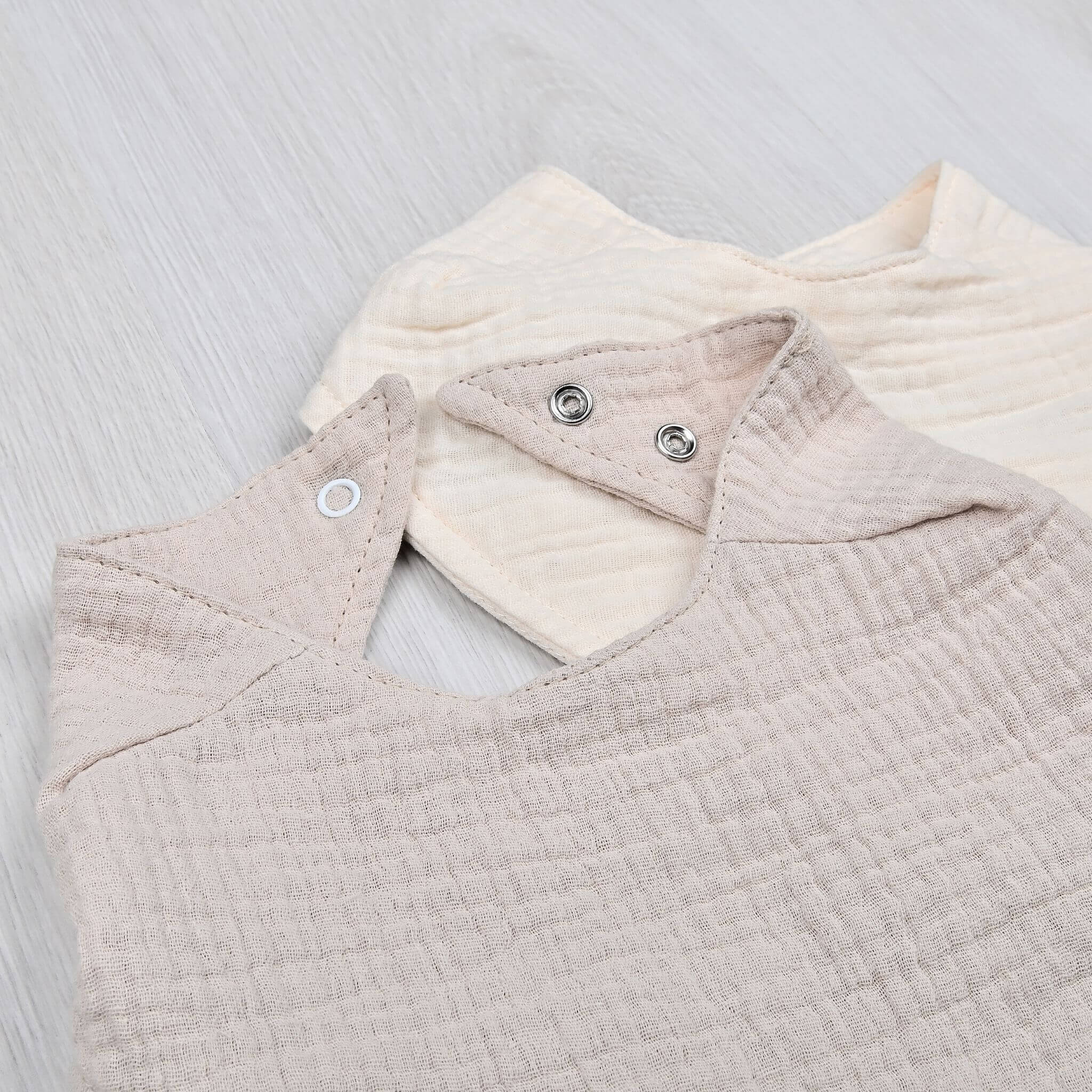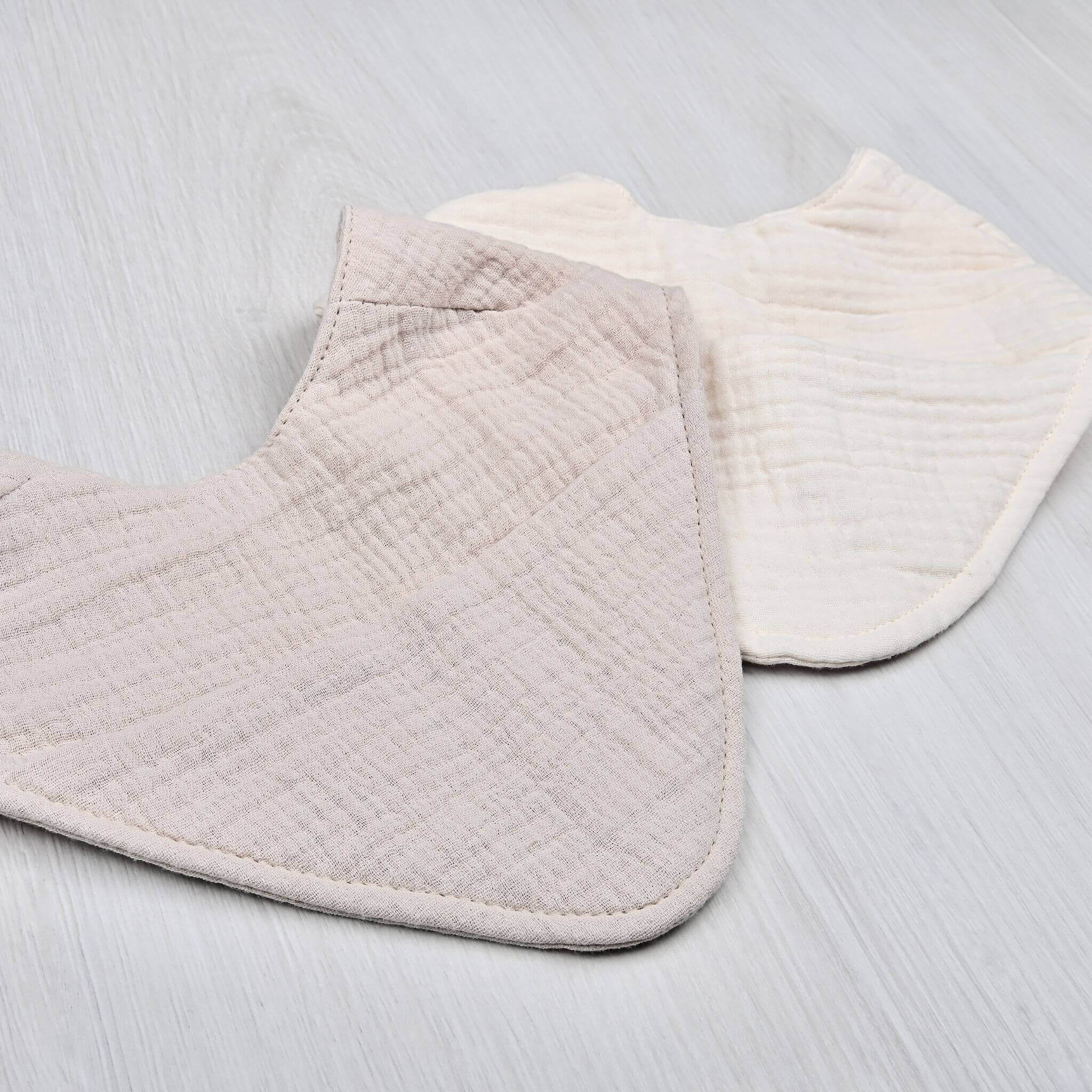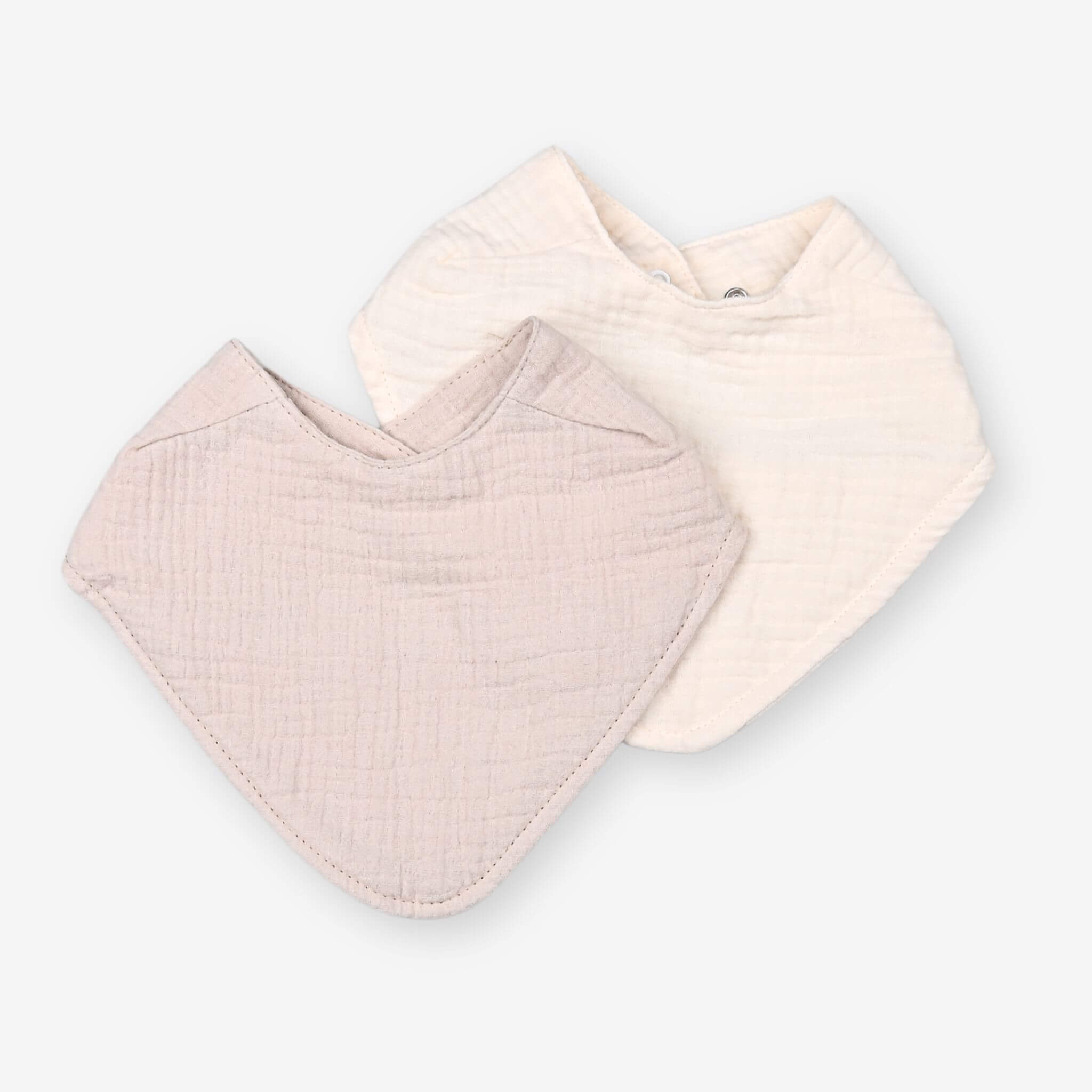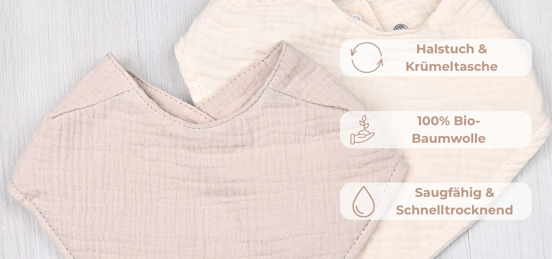 Das 2er-Set Musselin Lätzchen/Halstuch für Babys in den zeitlosen Farben Sand und Naturton ist nicht nur niedlich, sondern auch extrem funktional.